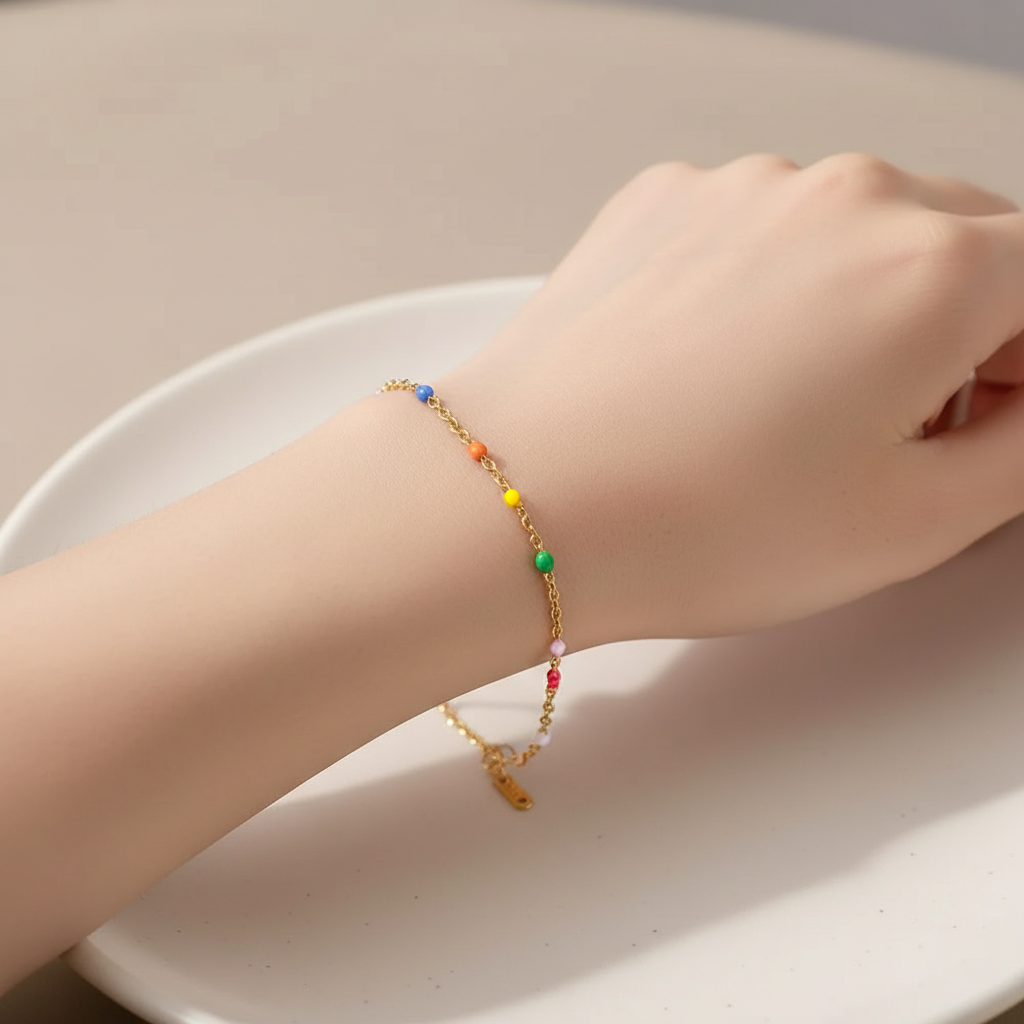 Accessorize your summer look with our playful Mini Bead Bracelet! Made with stainless steel chain, colorful beads, and 18k gold plating, this waterproof wrist jewelry adds a pop of color to your beach days. Perfect for women who want to make a statement.