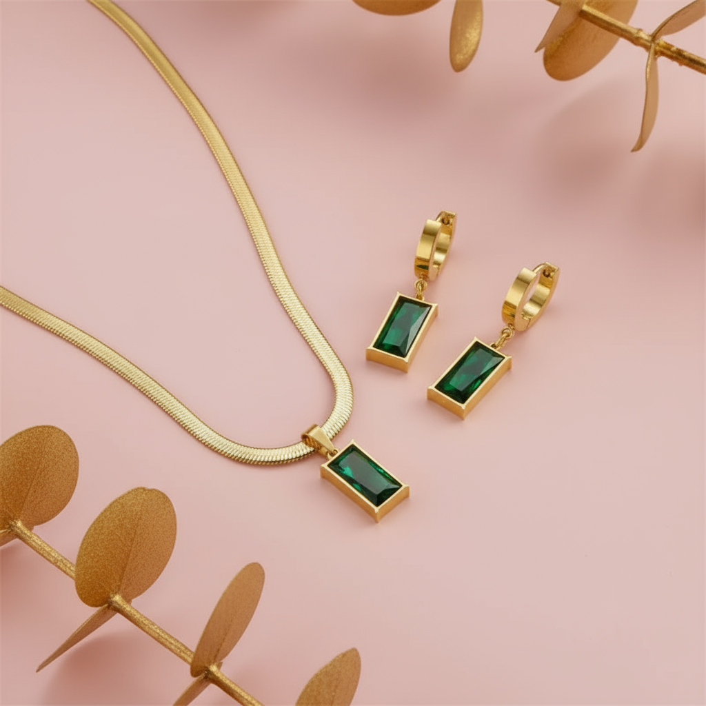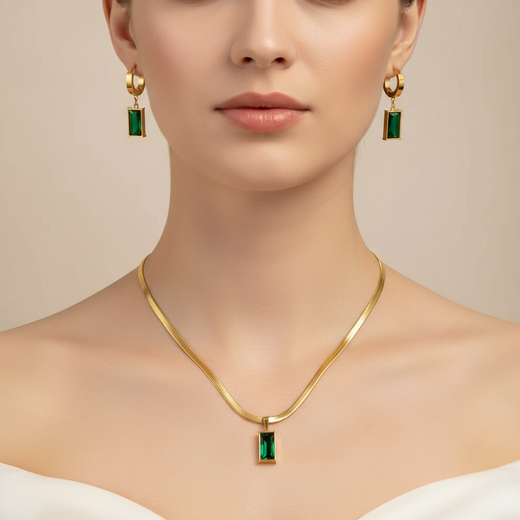 Transform any outfit into a luxurious and sophisticated look with our Emerald Green Necklace & Earrings Set. Made with Titanium Steel, the square Green Crystal zircon Pendant Necklace and Earrings exude elegance and style. Stand out with our non-fading, high-quality jewelry that will elevate your fashion game.